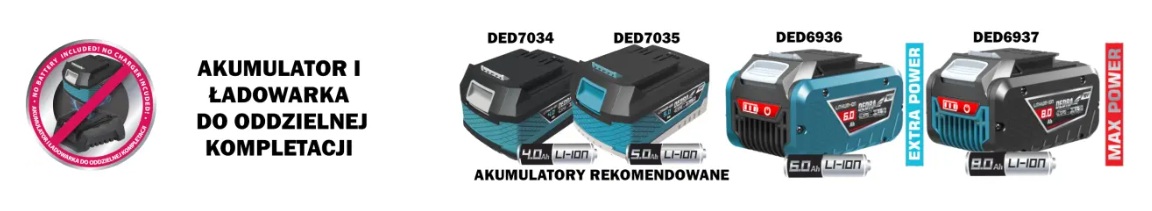 Rekomendowany akumulator do pracy z pilarką akumulatorową akumulatorową to 4.0Ah DED7034 lub 5.0Ah DED7035.