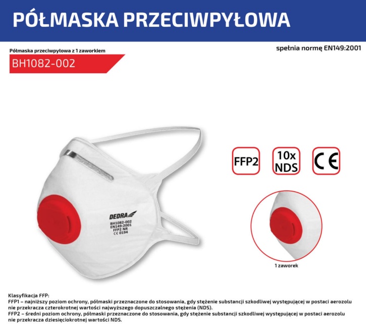 Półmaska przeciwpyłowa DEDRA BH1082-002 1 zaworek, FFP2, 2szt, CE